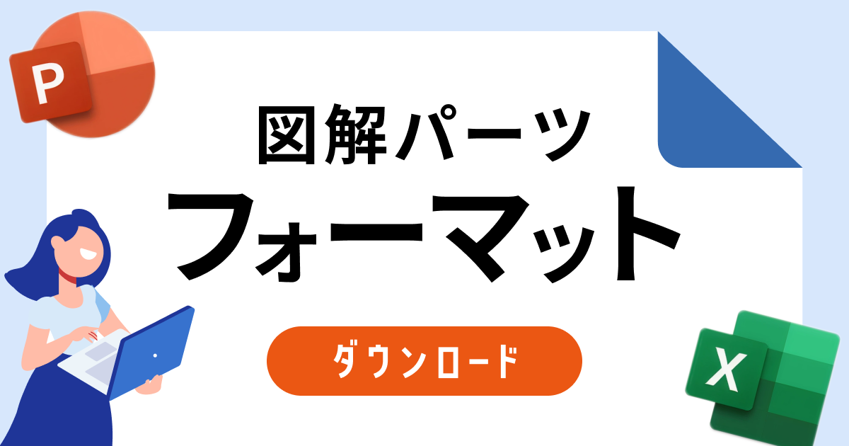 資料の構造や関係性、数値の推移などを分かりやすく表現したい時に使いやすい図解テンプレートです。