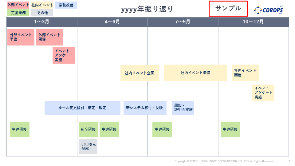 その時期に何に力を注いでいたのかや、業務の切り替わりのタイミングが見えやすくなります。
